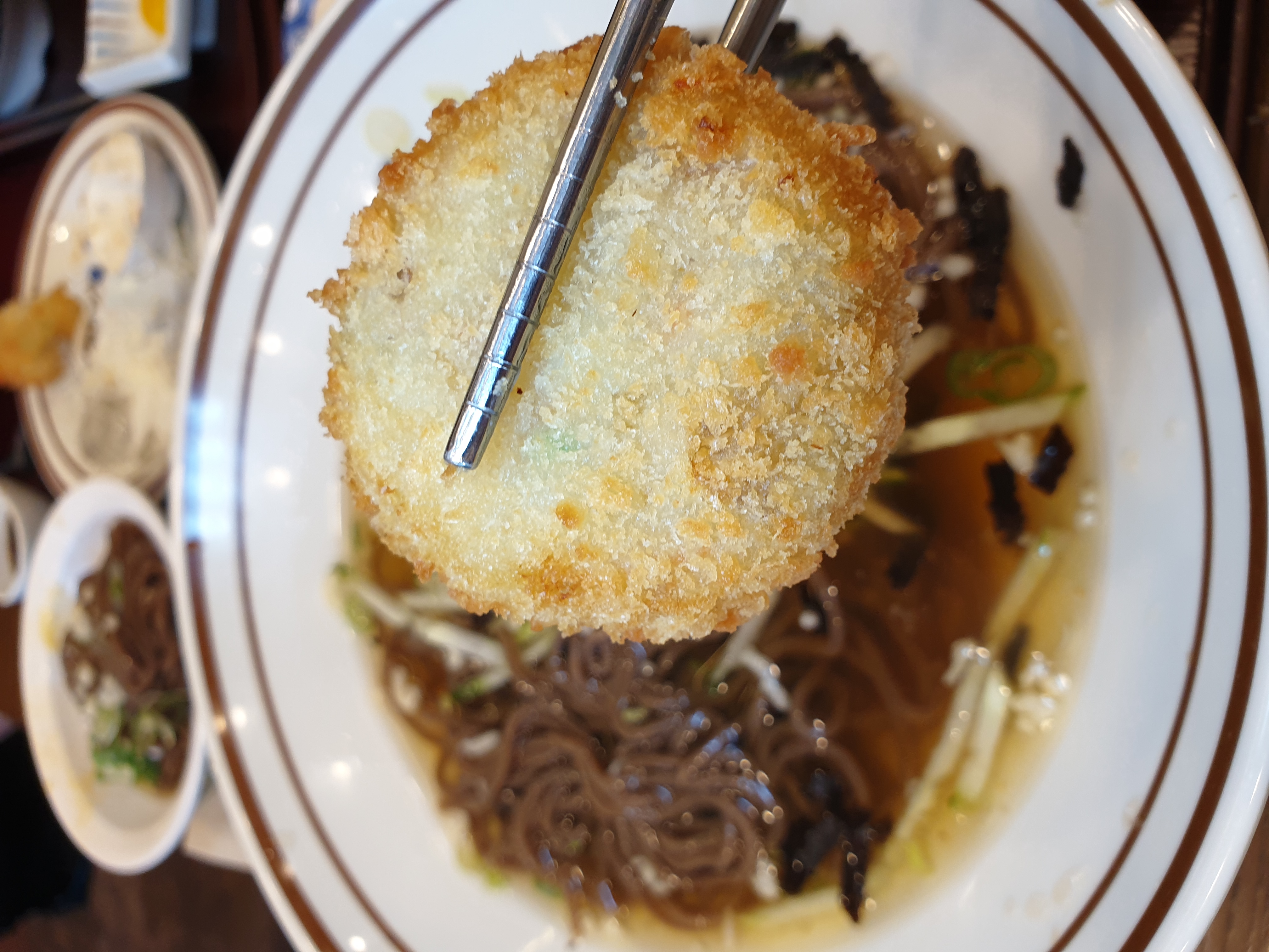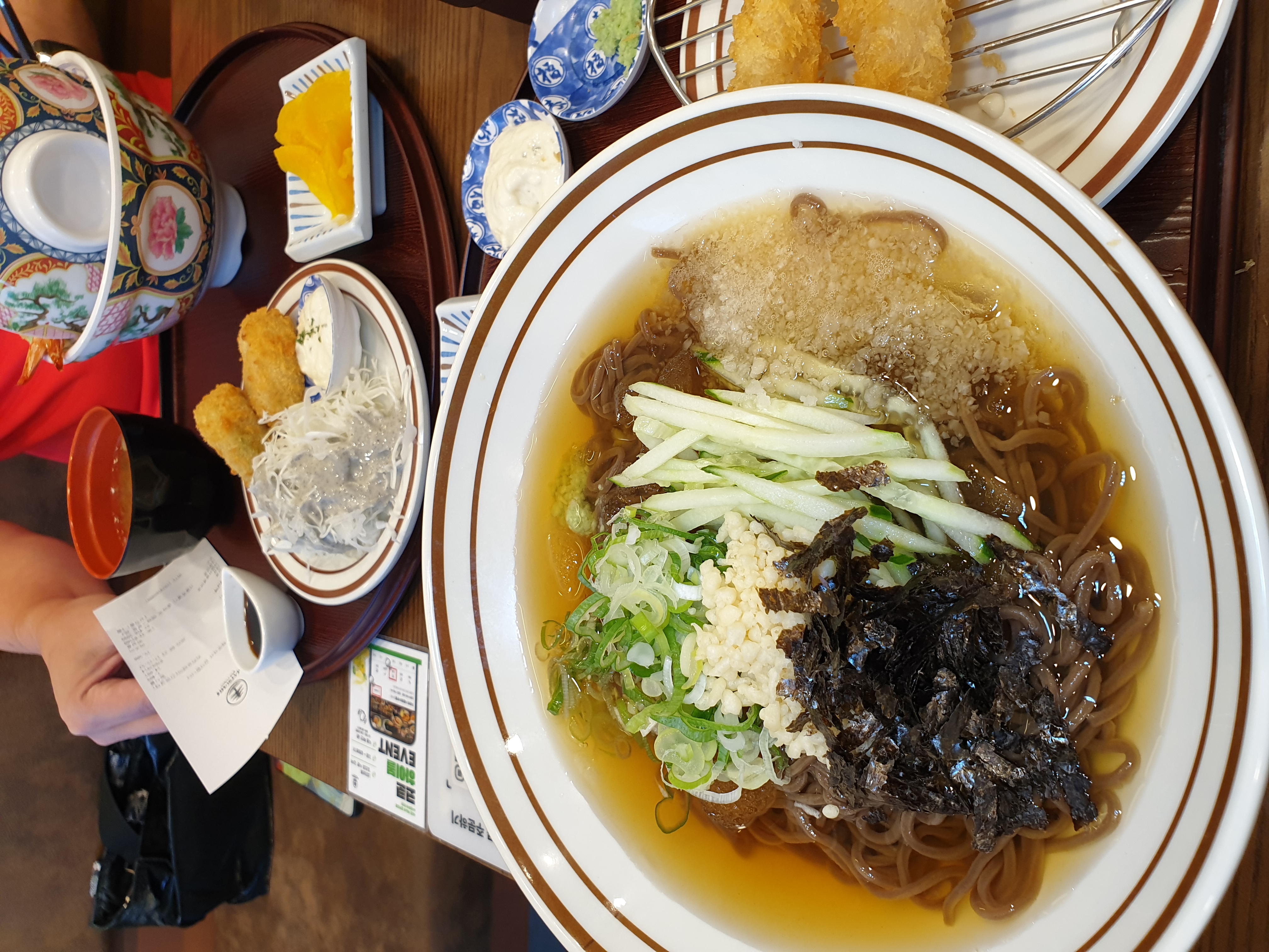 사진 속 구성처럼 냉모밀소바에는 보통 튀김류나 단무지 같은 곁들임 반찬이 함께 나옵니다