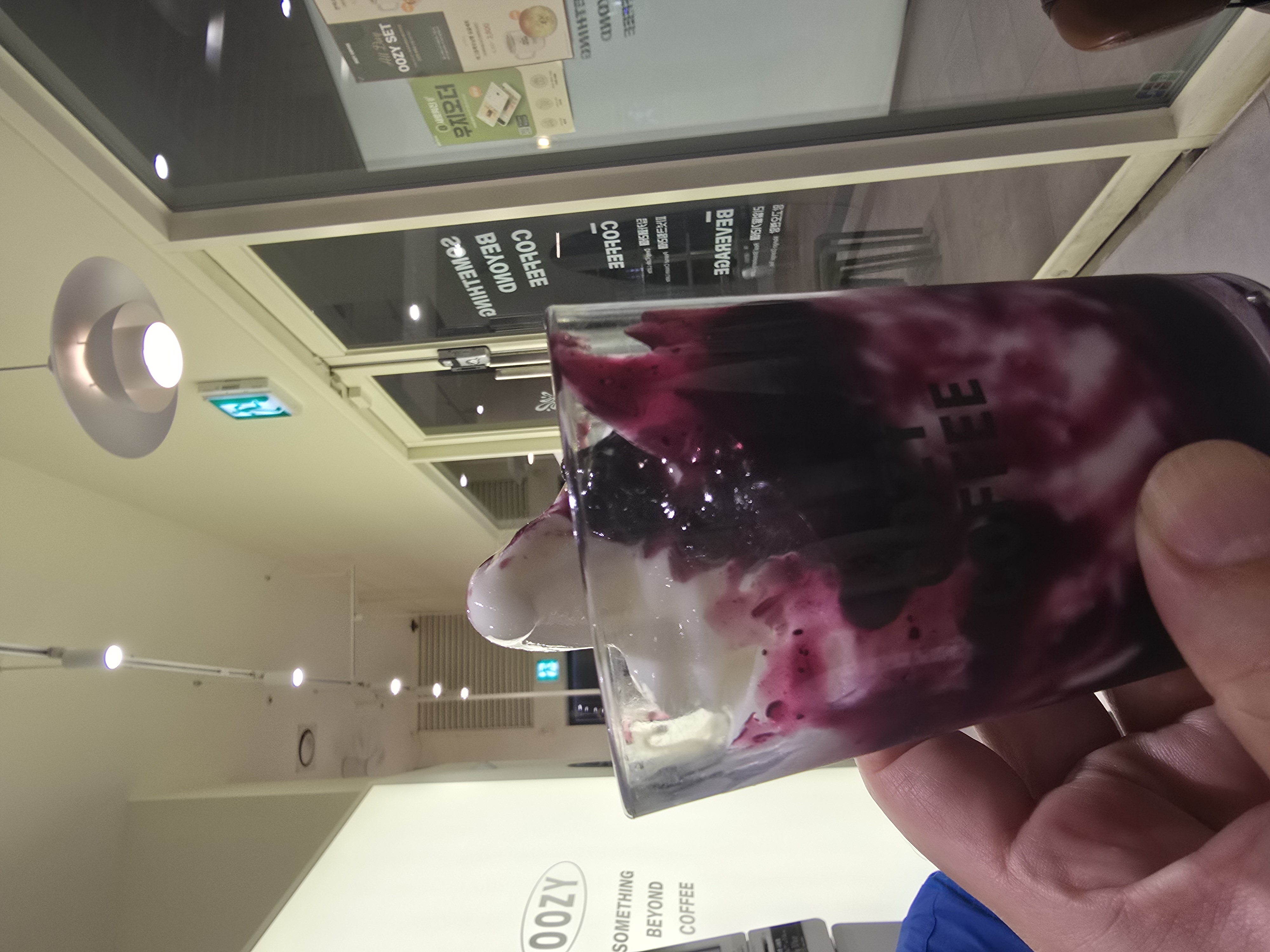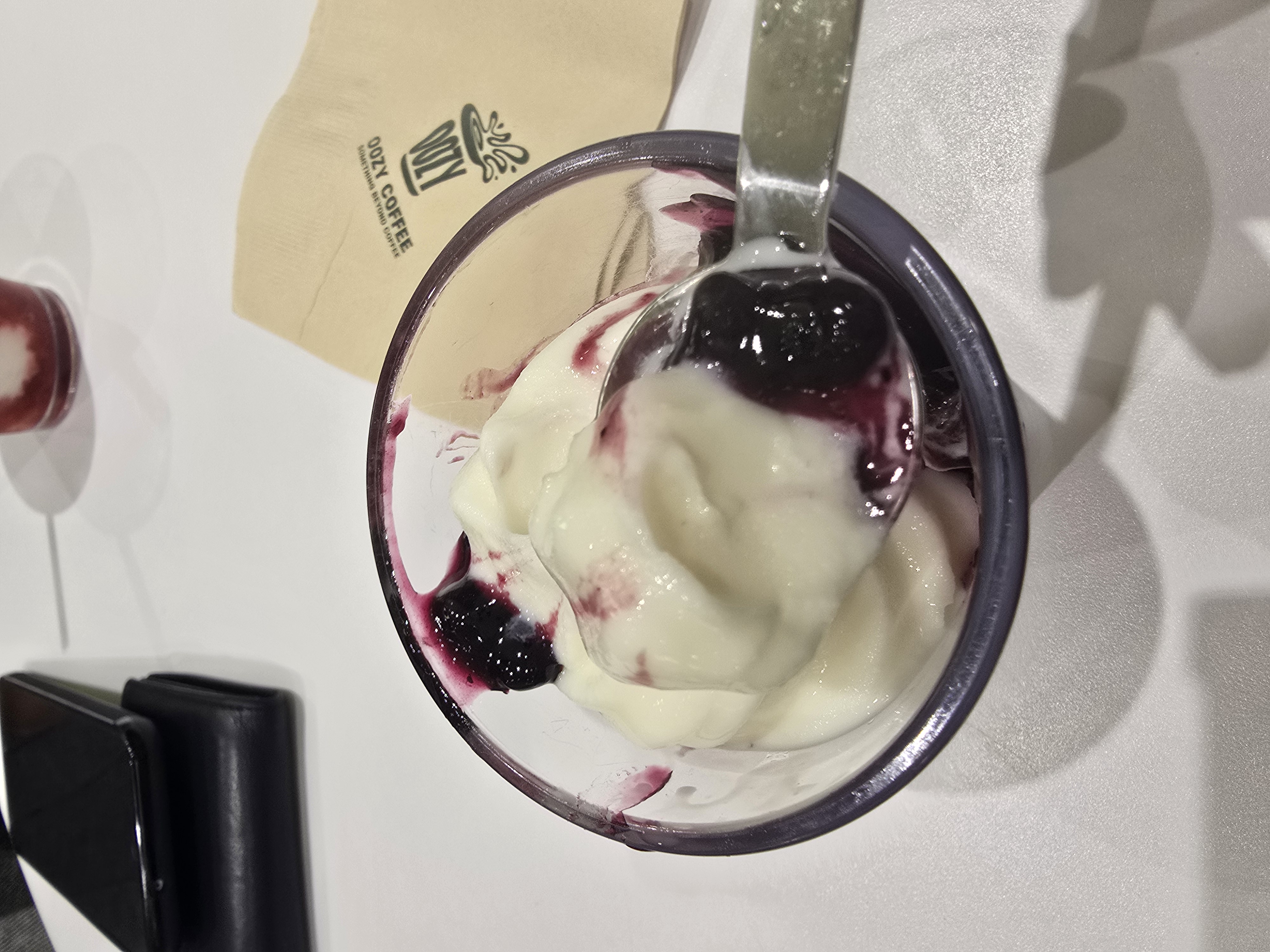 블루베리 시럽이 듬뿍 들어간 아이스크림은 시각적으로도 만족스럽습니다. 바닐라 아이스크림 위에 올려진 보라빛 소스가 녹아내리면서 자연스럽게 섞여 부드러운 풍미를 더합니다. 블루베리 알갱이가 씹히는 식감은 신선함을 주고, 산뜻한 맛이 달콤함과 잘 어울립니다.